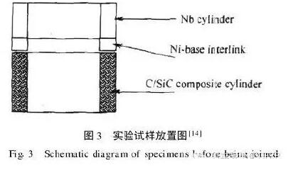 為了得到使用溫度較高的連接件,以滿足碳纖維材料的應用需求,童巧英等人采用一種熔點較高的Ni基連接劑作中間層,用液相滲透方法對用二維和三維編制的碳/碳化硅復合材料與金屬鈮進行連接。金屬鈮、碳/碳化硅連接試樣及中間層均制成圓環狀,如圖3所示放置。在1300℃、連接時間45min、真空狀態下進行連接,所施壓力為20MPa。結果發現,二維碳/碳化硅復合材料與金屬鈮的連接在從連接高溫降到室溫過程中已發生破壞,金屬鈮環與二維編織碳/碳化硅復合材料環發生脫離現象,而三維編織碳/碳化硅復合材料與金屬鈮環連接良好。這是因為,一方面,相對于三維碳/碳化硅復合材料,二維碳/碳化硅復合材料與金屬鈮的熱膨脹系數差異更大,使得在接頭產生較大的殘余熱應力,降低了連接性能;另一方面,是由于二維碳/碳化硅復合材料纖維相對于連接面的垂直度不高,使得連接較弱。