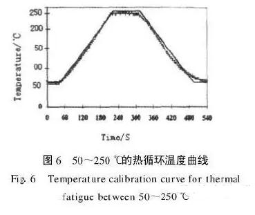 為了評估釬焊接頭的抗熱疲勞性能,需要進行熱循環測試。例如,對碳/碳復合材料與鋁合金20242T3膠結接頭的熱循環測試溫度范圍為50~250℃,一次熱循環包含五個階段:(1)50℃保溫30s;(2)用120s升溫到250℃;(3)250℃保溫60s;(4)用120s降溫到50℃;(5)50℃保溫30s。圖6為一個熱循環溫度曲線,其中,虛線所示為實際溫度曲線。
