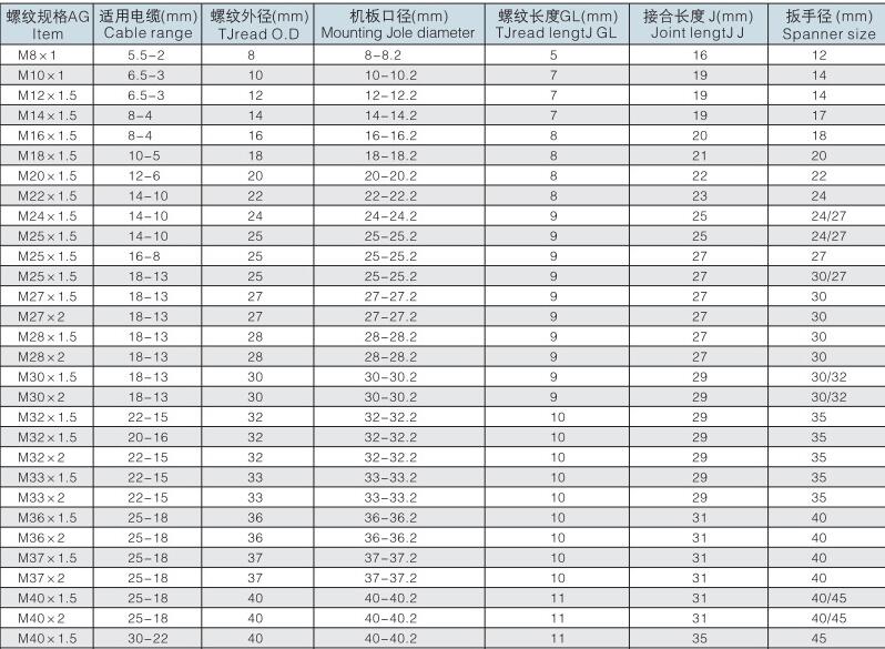 螺紋長度:配合緊迫頭裝配省時便利,夾緊電纜范圍大,抗拉力強、可防水、防塵、抗鹽、耐酸堿、酒精、油脂及一般溶劑。